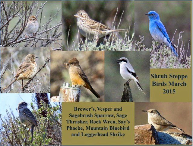 I led a fun Shrub Steppe field trip for Seattle Audubon in March with Jean Olsen. This is a compendium of birds seen on that trip or on the scouting trip in advance. It was great to get all of our targets. (As an aside I often put together compendia like this using PowerPoint, a good way to show comparisons or to picture groups like Washington Warblers etc.)