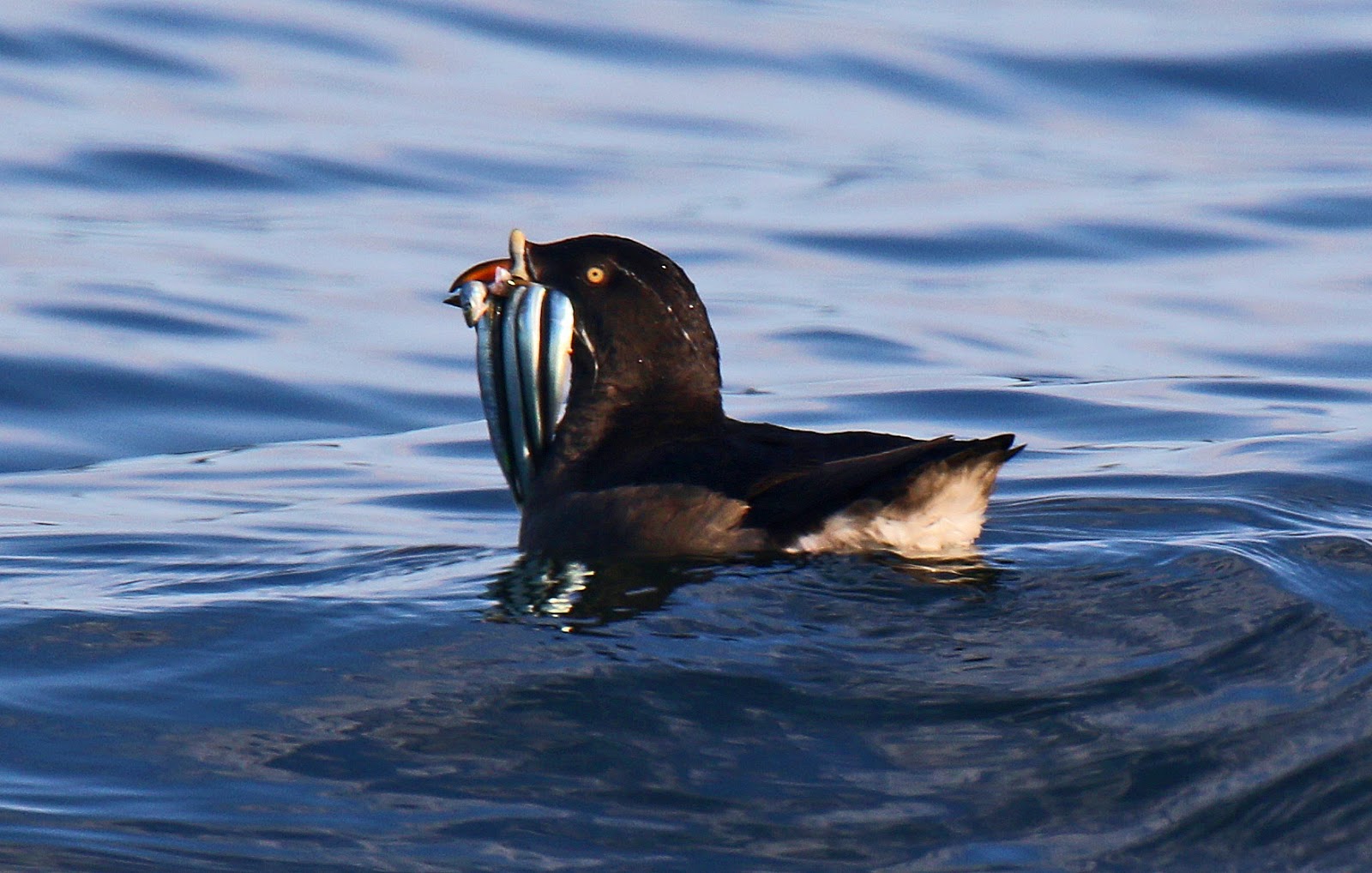 Rhinoceros Auklet with Fish/Tufted Puffin Protection Island June 27, 2015