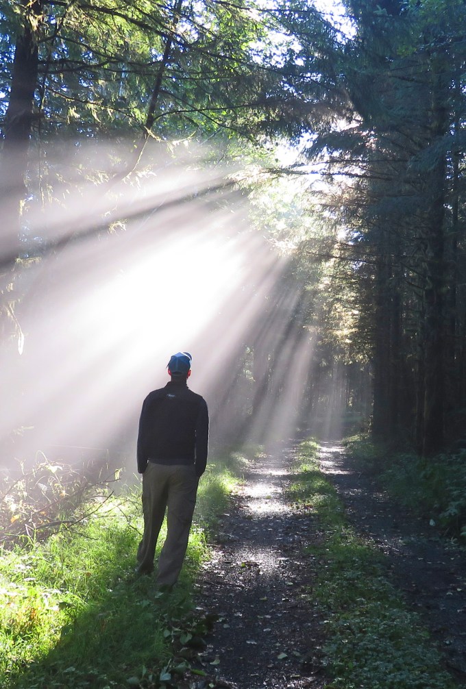 We also had a large number of Vaux’s Swifts, some Hutton’s Vireos, Red Crossbills and more Townsend’s Warblers than I have ever seen – 18. A Swainson’s Thrush was still singing and we also found a Warbling Vireo. But the highlight was the “light”. We had beautiful views of the fog in the Valley, the islands in the Pacific and a picture of Nathaniel in the forest broken light that I will just call “Enlightenment”.