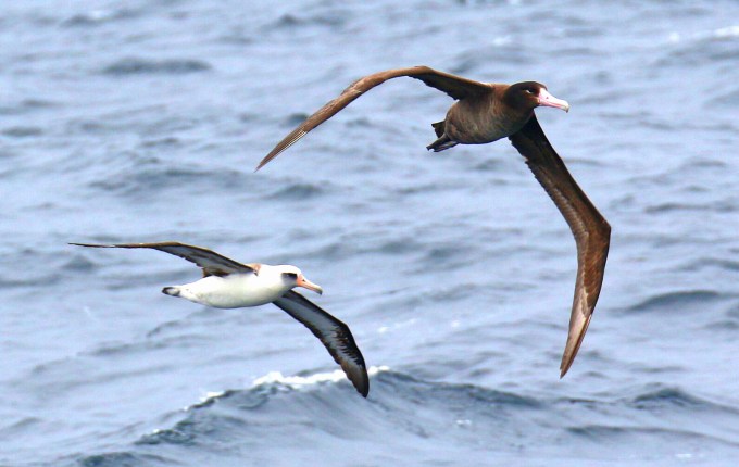 A Short Tailed Albatross is a big bird – 3 foot body and 7 foot wingspan and weighing over 16 pounds (a lot for a bird). When you see a Laysan Albatross alone, it looks big as well but weighs half as much with shorter wings and body. Both are amazing flyers. The Laysan is not common in Washington but I have been fortunate to see one up close and get a good photo and some are seen most years. All albatrosses have huge bills and big feet gving them a gawky look but oh can they fly.