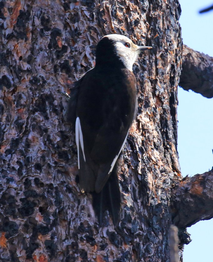 The area was beautiful as we went in and out of fields, sage, trees and had vistas of mountains, windmills and shrub steppe. As usual, I forgot to take scenery photos, so I only have the pictures that are in my mind. The road got rougher and rougher but we never felt in danger or ill at ease as Bill masterfully handled each rut, bump, rock and incline. After almost 2000 feet of vertical gain, Deb said we were approaching the spot where they “guaranteed” a White Headed Woodpecker. It was a thicket of burned trees – victims of one of the big blazes last year. We had already seen many burned pines and lots of trees that had been snapped in half by high winds that had followed some of the fires. Woodpeckers love burns – we were ready – but the first looks were not fruitful.