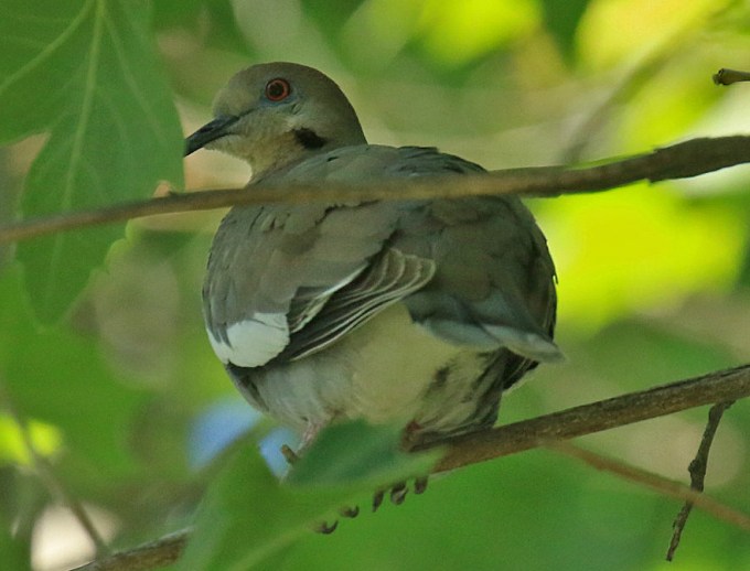 I arrived at Kevin’s a bit after 8 on Wednesday the 11th. His wife had seen the Dove earlier in the morning before she left but he had not seen it come down to the feeders yet – its normal activity. About 15 minutes later, Steve, Ann Marie and David showed up. We watched and waited and had a great visit with Kevin – marveling at his set up for taking photos and movies through his scope and also learning of his tracking activities including from a small plane. But the Dove was a no-show. Kevin took matters into his own hands and somehow managed to find the White Winged Dove perched in the close by large Sycamore tree – a favorite roost. We all got good looks and decent photos – even with a branch partially in the way. We also had a great look at a female Black Chinned Hummingbird that was almost too close to get in focus.