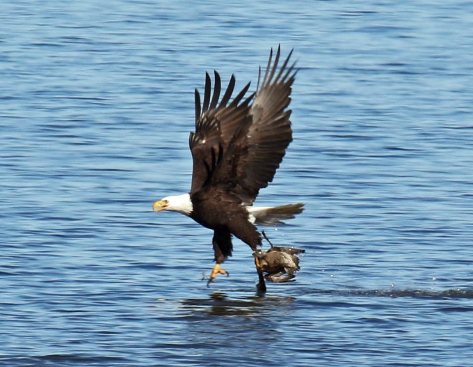 After a few seconds as the Eagles swerved and cartwheeled together, the capturing Eagle dropped its prize and, still alive, the Pintail fell to the water. But it was not going to escape. Exhausted and probably in shock and injured, it was picked up quickly by one of the Eagles (we didn’t note if it was the original captor) and again carried away.