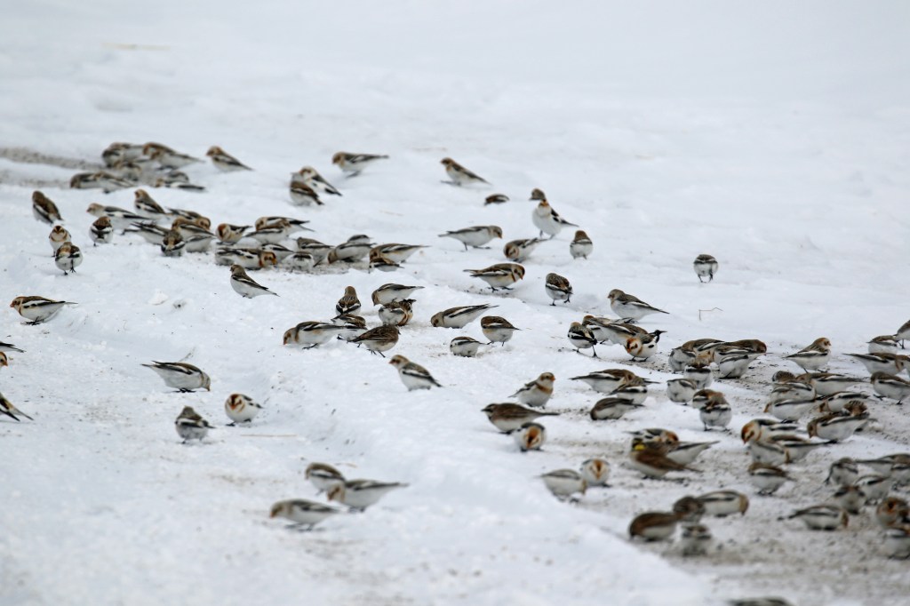 Just as Debbie had said, the Snowy Owl was distant and only its head could be seen among the rocks. Still good to see. I spent the next couple of hours driving around the Plateau with more than 25 miles on icy roads, checking every outcropping hoping for a Gyrfalcon. No such luck and all in all, there were far fewer birds than I had seen on earlier visits. Noticeably low counts were Horned Larks, and Snow Buntings. I doubt I saw more than 500 Larks and fewer than a dozen Snow Buntings and I did not see any Partridge. Raptors were fewer than expected as well with only a half dozen Rough Legged Hawks and even fewer Red Tails. A single Northern Shrike was perhaps my best bird. Granted it is a big area, but I cannot remember another visit where I did not flush Horned Larks on nearly every road. One year I wondered if I had seen more than 10,000. And I have often seen flocks of more than 100 Snow Buntings.