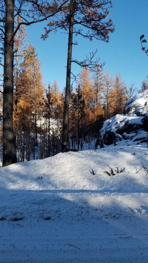 It was decision time. I wanted to check out Cameron Lake Road and I also wanted to get into the Okanogan Highlands to look for owls and hopefully visiting northern finches. There was not sufficient time to do both. Jon Houghton had detailed significant fire damage along Cameron Lake Road when he visited earlier so the birding prospects were not great, but I had always had good luck there (except for those two flat tires some years ago) and although it would take at least an hour, there was time for that before dark. The fire damage was depressing indeed with wide swaths completely burned – both brush and large trees. I wondered if the trees would still be there at my White Headed Woodpecker spot near the flag over the road. The trees were there but mostly charred and lifeless. I found no Woodpeckers or any other birds there. It was not much better elsewhere along the road. The Tree Sparrow woodlot was essentially gone. I had a couple of Kestrels, some Magpies and some House Finches. A couple of Ravens flew by and there was a single Northern Harrier. As I descended back towards Highway 97, two birds rocketed out from the snow next to the road. They were the Gray Partridge I had hoped to see, but not this way as they were gone before I could even stop the car.
