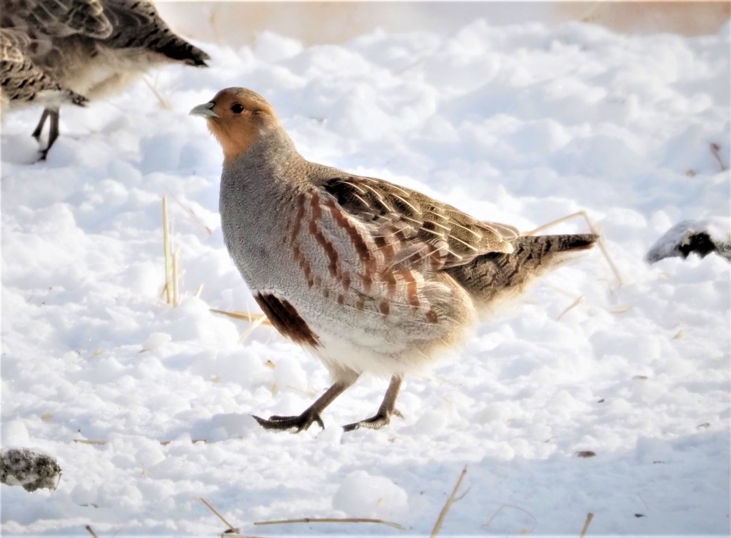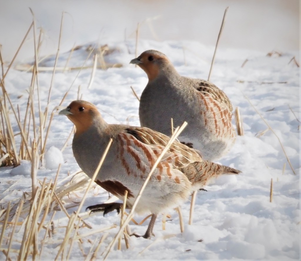 I did not keep track of the exact route but I did retrace some steps back along Havillah Road. At one of the few homes along the route, directly across from some small grain silos, I noticed a number of small birds flitting around. Would I finally find some of the sought after northern finches? No – only a large flock of House Sparrows, but then two larger birds flew past and landed by the silos. I had seen a number of Eurasian Collared Doves but these were Mourning Doves but more importantly they were “guide doves” as they took my eyes to a small structure near the grain silos where on the ground were several Gray Partridge. I maneuvered my car nearer to them and watched and took many photos with ultimately a dozen Gray Partridges appearing and disappearing maybe 40 feet in front of me and with light behind me and on them when they were in the open. Now I had really good views and photos of this species – perhaps a good close to the day.