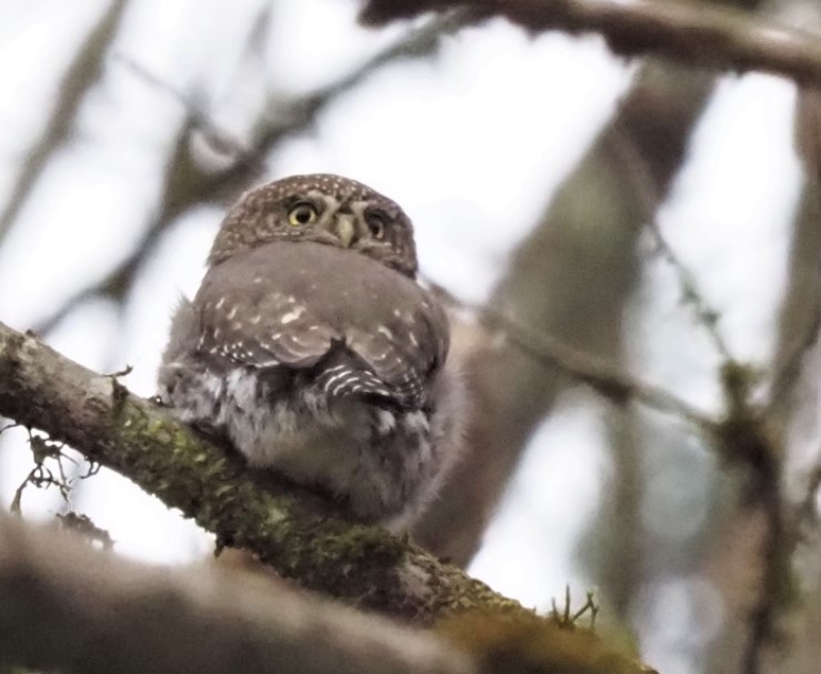 I drove the length of Siwash Creek road which was beautiful and quiet. I stopped at a couple of places and searched for Northern Pygmy Owls without success. Birding would probably have been better if I had gotten out of the car and really looked for passerines but I had a lot of ground to cover and it was now 12 degrees. In previous posts, I have often stressed that when we get out into nature and are open to them, there are often surprises and even when main targets are missed, there are usually consolation prizes. It was time for one. Two fairly large birds appeared in the sky in front of me and to my left, maybe 30 feet above the treeline. At first I thought they might be ravens but as they drew closer I was pretty sure they were game birds even if their altitude above the trees seemed odd. I was in a forested area by the creek and as the birds continued their flight, my sight line was temporarily blocked by the trees but their flight path looked like they might be coming in for a landing. I got lucky and both birds landed on tree tops maybe 75 yards away. Through my binoculars I could tell only that they were grouse and with terrible backlighting I could make out no details other than a small crest. Were they Ruffed Grouse (which I had seen on tree tops like this before) or Sharp Tailed Grouse which I had never seen in anything but short low flights? Even through my scope with no direct lighting, I just could not tell.