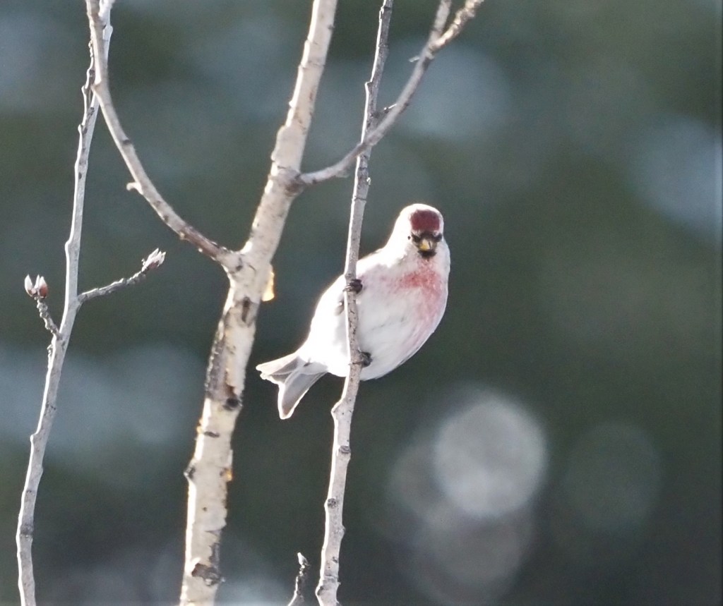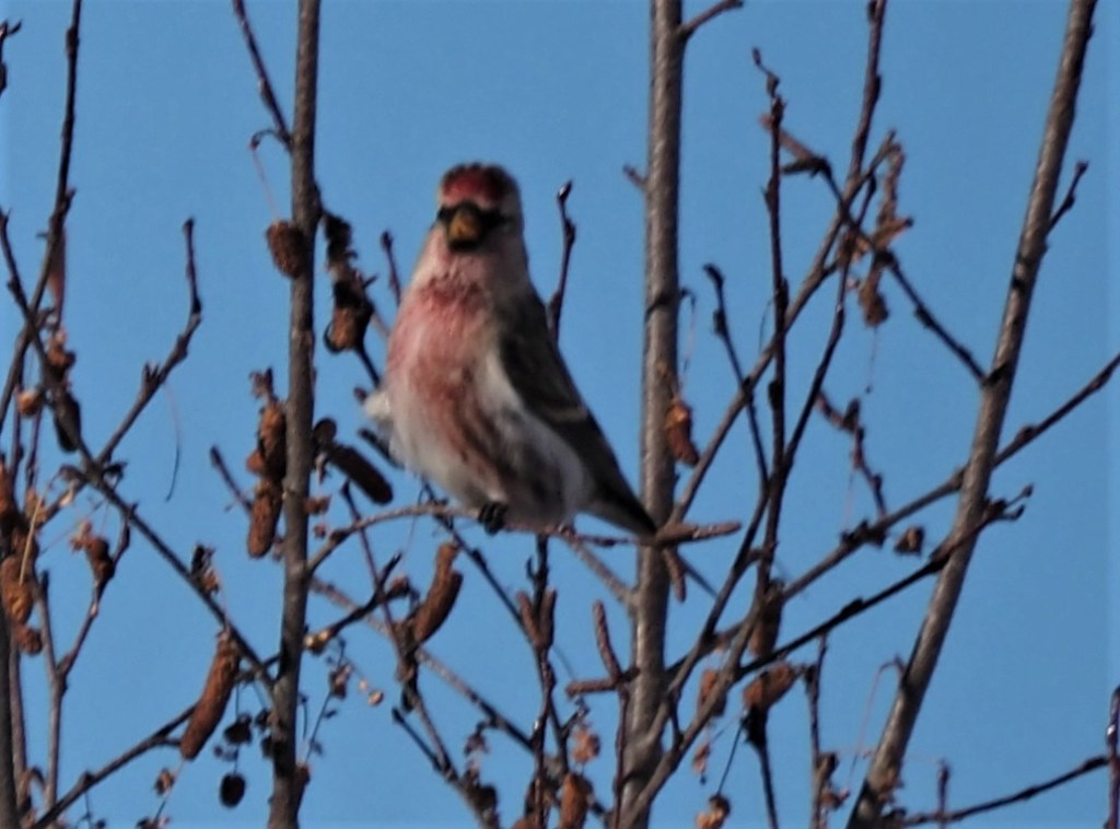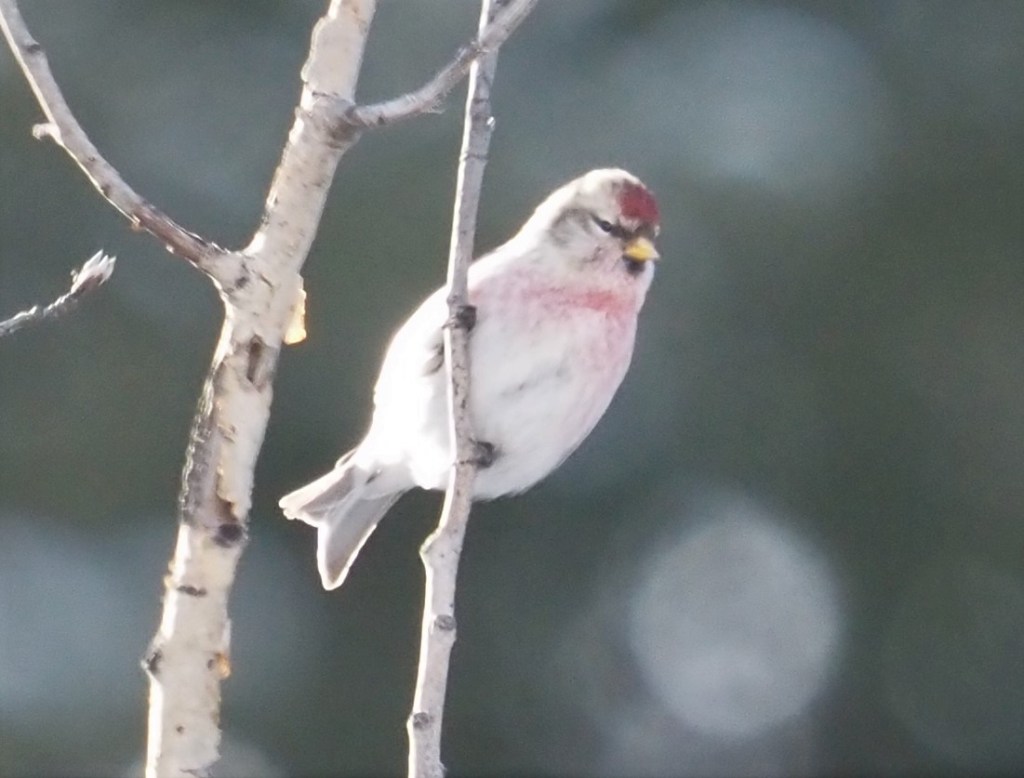 Day 4 started in the Okanogan Highlands. Not as much snow as when I had been there in January but truly beautiful. My first new species was a Prairie Falcon flyover near Tonasket. I had planned on a gimme Chukar on Fancher Road where I have seen over 100 – but not a one – a very bad miss. On Mary Ann Creek Road I finally found a Northern Pygmy Owl but only a distant view and no photo which was disappointing. I kept looking for big flocks which could be the Rosy Finches or even Bohemian Waxwings, but it seemed like it was not to be. UNTIL – a very large flock of small birds appeared out of nowhere on Chesaw Road. At first I thought they were Pine Siskins but to my delight when I was able to to pull over for a look through my binoculars I found they were all Redpolls. I was able to get a couple of pictures and then they all took flight scared off by an oncoming pickup truck, the only vehicle I had seen that day. Bad timing. Or maybe not as the flock resettled for a couple of moments and this time as I got my bins on them, one jumped out. All of the others were fairly dark with the mix of brown backs and sides, streaked breasts and red caps (polls). This one was super pale with a much smaller red cap, barely any brown or streaking a rosy cast to its chest. I was able to find it again in my camera viewfinder and got two photos before again the entire flock of more than 110 Redpolls flew off and disappeared. Could this be a Hoary Redpoll? Extremely rare but not unheard of in Washington, it is a very difficult ID, but this bird sure looked good. It is likely that Hoary Redpoll may lose its separate species status in the near future, but for now it is recognized. The Washington Bird Records Committee will weigh in on the ID, but I sent the photos to some noted ornithologists who gave a thumbs up. Good enough for me for now. and a find that makes iup for some misses.