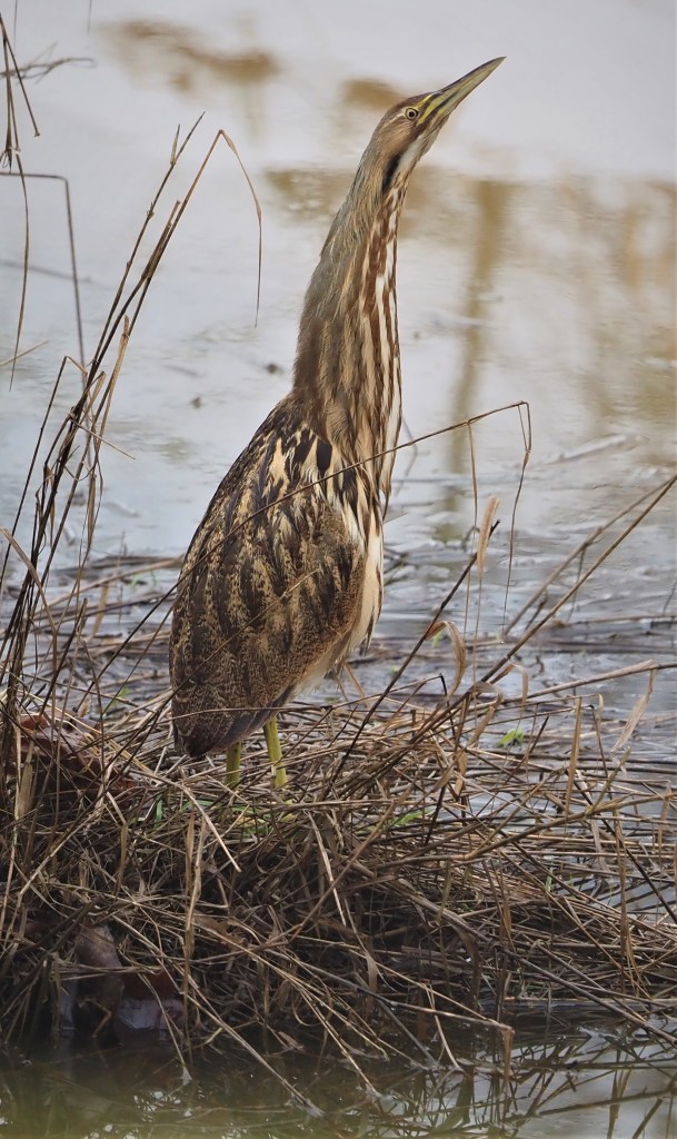 Heading home just before Bottle Beach I could see that although it was 2.5 hours before scheduled high tide, the water was already high and it would be pointless to stop. I headed instead for the Brady Loop where needed Wilson’s Snipe had been reported. I did not find them there in the snowy fields but did get my first of month Purple Finch and Western Meadowlark. The traffic was good so I had time to stop by Nisqually NWR where there was also a chance for Snipe. There was lots of snow and some trees had fallen across the boardwalk path. I bushwhacked over them and at the end of the trail in a pond between the dike and the old barn I got the best bird of the trip – an American Bittern posing in the open. These birds are regular but can be very difficult to find. No Snipe but it was new species number 9 for the day – a great ending.