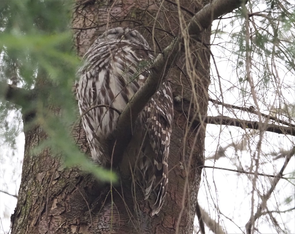 On the way back home I got a call from friend Jon Houghton who shared information that Frank Caruso had found a perched Barred Owl in Yost Park in Edmonds. They have bred there for the past several years but have been tough if not impossible to find this year. I called Ann Marie Wood and shared the information. She had not seen one this year, so we met and trekked down the trail together finding it exactly where Frank had left it a couple of hours ago. It was not a new species for the month but the earlier one in Pine Ridge Park was heard and only briefly seen in flight so this was much better even if the photo is not award winning.