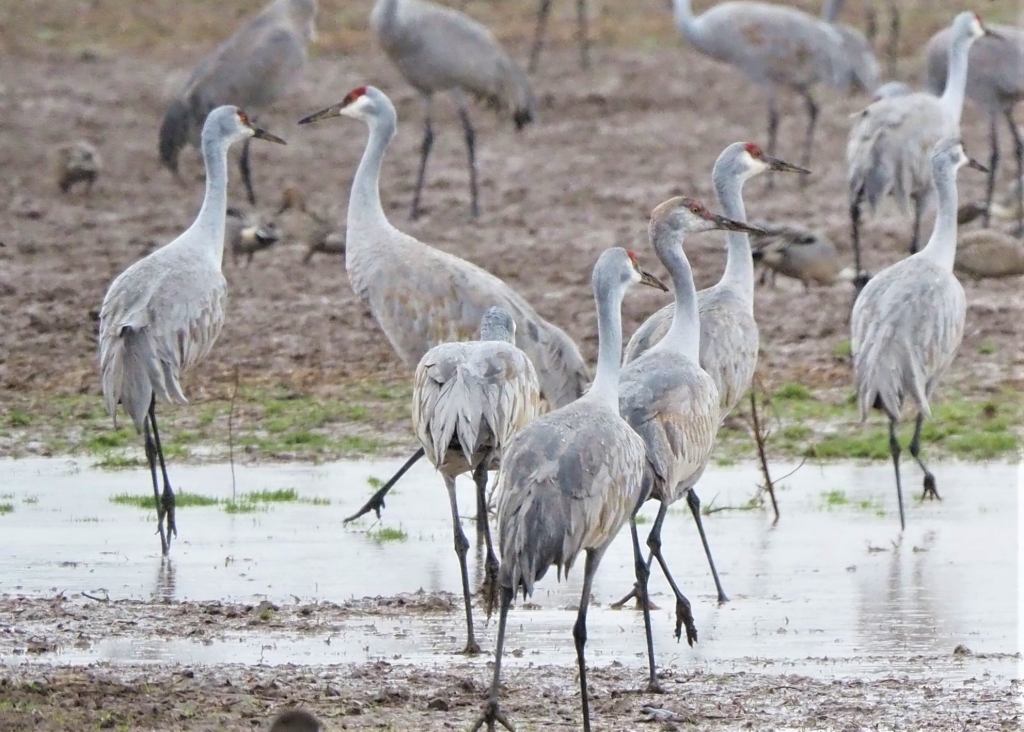 No mountain pass and the addition of the Swainson’s Hawk determined my choice – with the knowledge that I would probably have to go to one or even two of the other locations later. So early Monday morning I again headed south planning to stop first to try for the Swainson’s Hawk in Woodland then try for the Woodpeckers, then the Swallows and hope for a Red Shouldered Hawk somewhere along the way. If time permitted I would go for the Heron on my return. I found the place in the Woodland Bottoms where the juvenile Swainson’s Hawk had been seen the previous day. On my first pass, I did not see a single raptor. As I retraced my route, I found a hawk perched in a direction where I would not have noticed it coming the other way. I grabbed a photo and then watched it fly off. There was no red in the tail and I was pretty certain it was the juvenile Swainson’s Hawk – a species that had not even been on my possibilities list originally. Later when I had a chance to review the photos without the influence of seeing what I wanted to see, I concluded that I had a much more likely Red Tailed Hawk so this species was counted for a day but then moved over to my “not really list”. Instead of including that errant photo, I include one of a group of Sandhill Cranes – always great to see anywhere and especially easy to find in Clark and Cowlitz Counties.