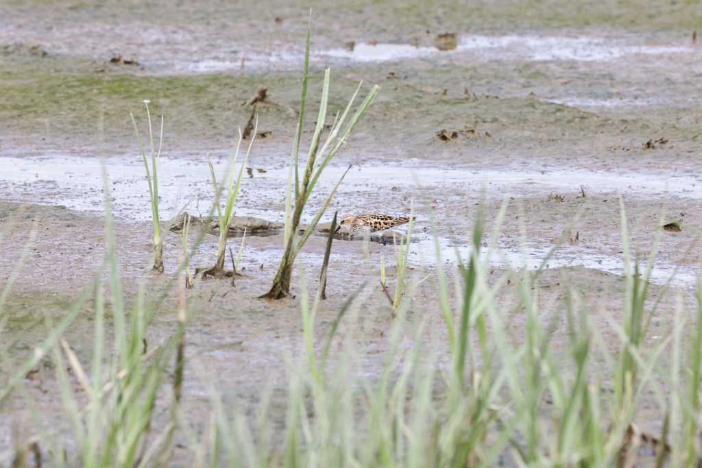May 25th – The Rally – After missing the Little Stint on the 24th and hearing it was seen later, I figured I would try again on the 25th but the question was “when”. There was an early morning report that it was seen in a different area – far out from the end of the gravel trail. As an important part of our move, I had to take things from our old storage area into our new one. This meant dismantling and then reassembling storage racks. I thought I had made great progress on them on the 23rd and 24th and it would be a simple matter to finish the last one on the 25th. Such was definitely NOT the case, as in order to get the shelving onto the frame, I had to undo much of the earlier work. Frustrated by that, I miscounted the “holes” where the supports had to go and the shelving was therefore misaligned. This meant more backtracking and more frustration which was made worse as I saw the opportunity to go for the Stint (an hour away) disappearing. After much cursing, I put everything down (except my phone to continue to check Stint reports) and took a 30 minute “breather”.