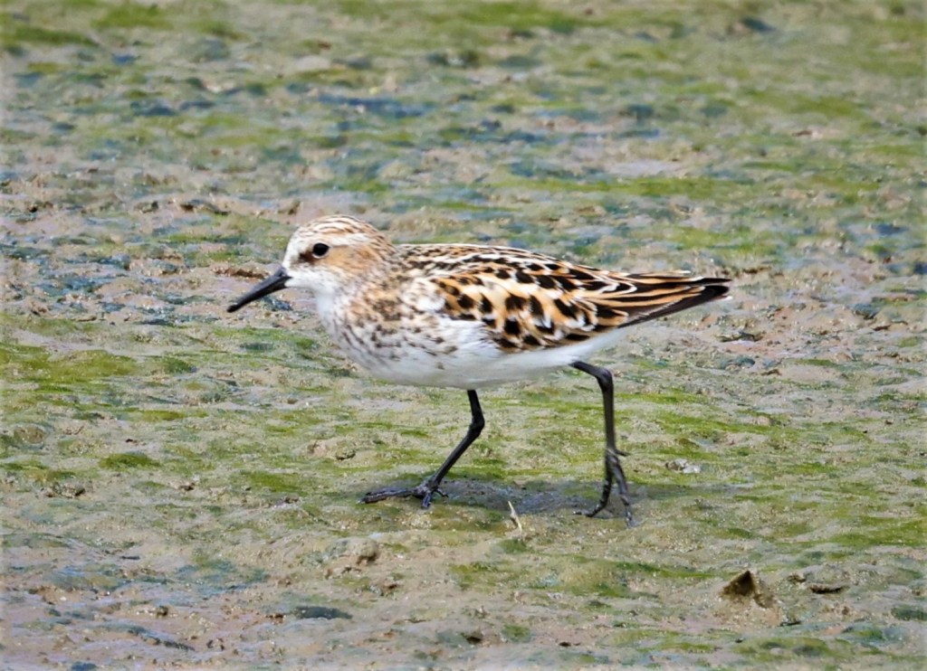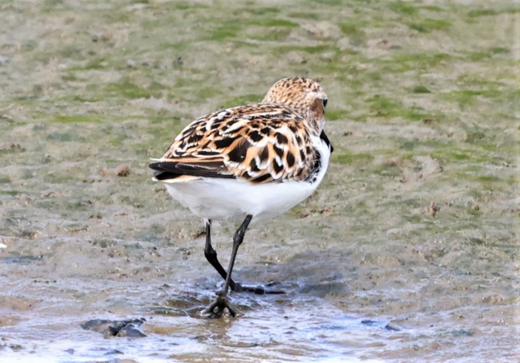 The Stint and the Western Sandpipers were feeding in mud between grasses on flats about 250 yards away from us. We were on a raised dike that enabled us to see over most but not all of the short grasses and the birds were actively moving making observation more challenging. The light was good but changeable making colors even harder to discern as what looked bright orange in one moment became a duller rusty brown in another. It was executive decision time. There is a crude “almost path” that leads from the end of the dike out onto the mud, or at that moment with such little water, onto a grassy barely muddy area adjoining the mud where the birds were feeding. With boots on my feet, camera and binoculars around my neck and scope over my shoulder, I scurried down the rocks adjoining our path/dike and headed west towards the muddy area where the birds were scattered, hoping for a closer and better view, a more confident identification and even possibly a photo. Almost everyone else followed.
