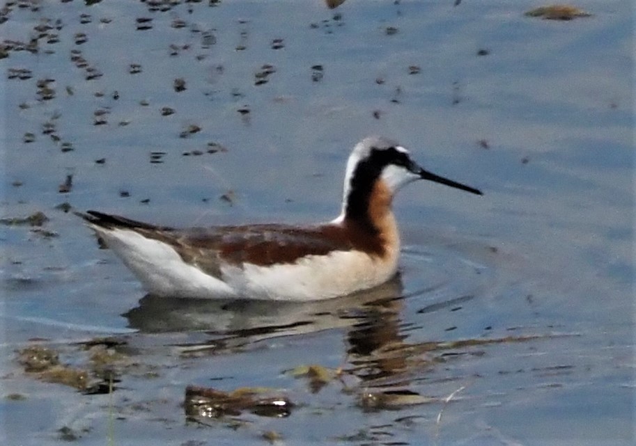 Much more relaxed I returned to the storage room and finished my project – and it looked GREAT! Part of my relaxing had been seeing the continuing reports not only that the Stint remained but that the water level was and would continue to be very low, so the area where the Stint was being seen would not be adversely effected. At 12:10 pm I was able to head north to Eide Road/Legue Island. Traffic cooperated and I pulled in to the parking lot just after 1:00 pm and saw birders I knew leaving with triumphant smiles on their faces and encouragement to just join the others at the end of the gravel path near the bench. Others arrived and we hiked out the half mile or so to the end of the path where maybe 5 others were peering through scopes – hopefully at a Little Stint. Good birding friend Paul Baerny was there and he said he had just had it in his scope but it was moving around. Then he had again – he thought – the one that was really orange. With his help, I got my scope onto the group of sandpipers that included the Stint and looked for the orange one. The trouble was that they were really very distant and that depending on the light and their movements, many of them looked orange. Some orange ones were definitely Western Sandpipers but how about that one – or was it that other one?