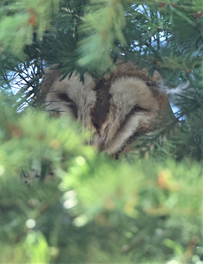 I joined Steve and Ann Marie took us to the tree where the owl had been roosting. We found several “regurgitated pellets” and some whitewash (aka owl poop) and I saw a couple of feathers in the branches but we could not locate the owl – until after maybe 10 minutes, Ann Marie somehow found its heart shaped faced buried deeply in the foliage. Owls are always special and it was nice to see it with Steve and Ann Marie, two of the people I have missed most during the COVID caused isolation of the past 18 months.