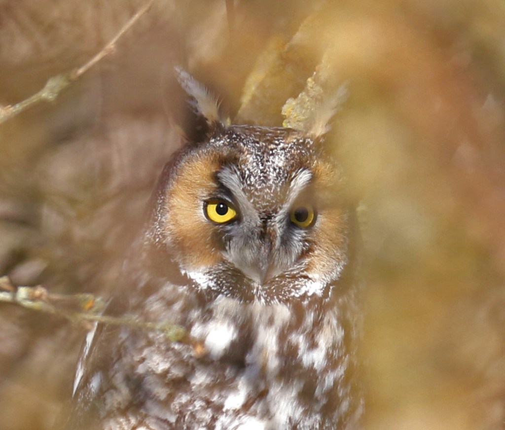 We continued on towards another stand of Olives on Smith Springs Road. A few years back on one of the Dennys’ Annual Owls by Day trips we had 7 LONG EARED OWLS in this spot. Before getting there we added the first new species for a day when MerryLynn called out a group of 8 RING NECKED PHEASANTS in a field. This species is found all through the state but many of the observations reported on Ebird are birds that were most likely released by Fish and Game for the hunters. No way to tell wild from “farm raised” but chances are much greater for the former in areas like this. At our Russian Olive stand, the keen eyes came into play and picked out two LONG EARED OWLS that I doubt I would have seen on my own. One was very low to the ground and was perfectly camouflaged. I could not get my camera to focus through the thick branches so I am including a photo from the same stand of trees on a previous trip – still somewhat buried but recognizable.