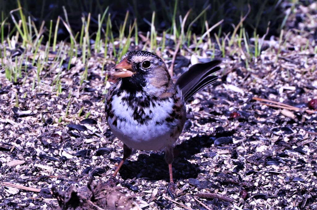 It was a good choice. The MOCKINGBIRD was calling from a Russian Olive near a marsh that had hundreds of very noisy SANDHILL CRANES. I am often amazed at how noisy MOCKINGBIRDS can be and yet they can be buried in thick growth and essentially invisible – until they decide to come out and then perch conspicuously in the open. This fellow never made that decision remaining buried. On to Vic Hubbard’s home in Pasco. I did not know Vic but got his phone number from Phil Bartley, a great birder and acquaintance in the area. Vic gave great directions and said to drop by anytime. He was working on some projects but would come out if he could. He came out as soon as I arrived and we had a great visit, The visit included super appearances by the adult HARRIS’S SPARROW that had visited his feeder for several months. He also had a juvenile, but I did not see that one while I was there.