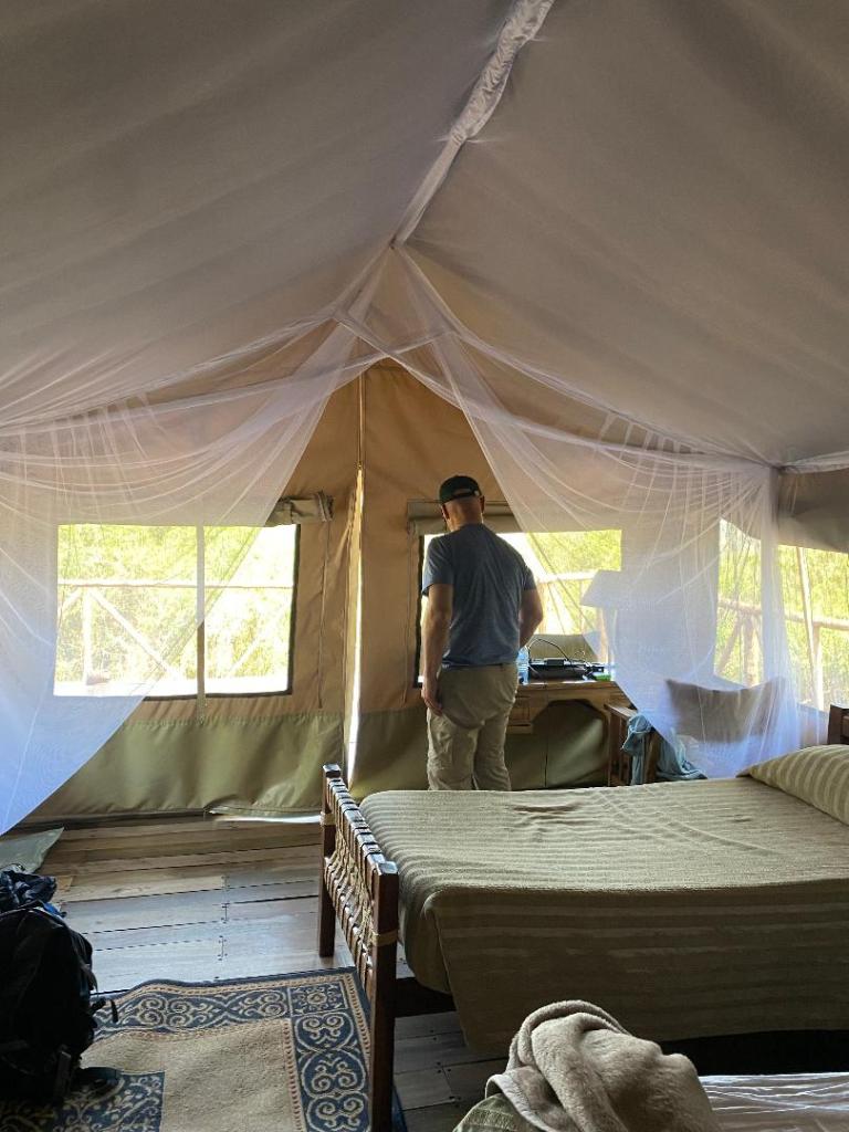 We moved to the Mantana Tented Camp for the night. Very much like the Kubu Kubu Tented Camp in Tanzania, this was not my idea of a tent. It was a significant if somewhat soft walled structure on a wood platform with nettings and zip up doors and a zip up wall dividing the sleeping area from the self contained bathroom with shower and flush toilet. As would turn out to be the case in some other accommodations, the only internet service (wi-fi) was at the main hall/reception/dining room and there was limited if any ability to charge electronic devices except there as well. These were NOT major issues but were another example of a difference between our lodgings in Tanzania and in Uganda. We were the only people at the camp and were treated very well by friendly, competent and gracious staff. Showers were by hot water that was delivered at whatever time was requested. It took a little tinkering to get the mix between hot and cold water right but the water pressure and availability was great. As with everywhere else in Uganda (and in Tanzania as well), bottled water was provided for drinking and tooth brushing etc.