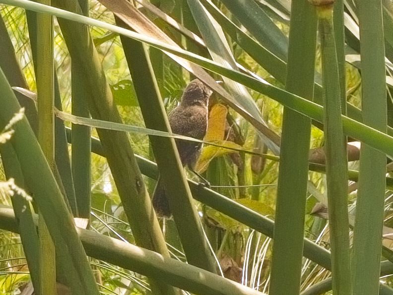 I had two other lifers on this excursion: the Medium Ground Finch and the Galapagos Flycatcher, both endemics. As mentioned before, the finches are probably the most famous birds of the Galapagos because of their importance to the development of the theory of the origin of species through natural selection developed by Charles Darwin. Somehow perhaps millions of years ago, the precursors of these birds made it to the Galapagos in sufficient numbers to begin breeding. It is theorized they crossed the many hundreds of miles of open ocean either due to a storm or a raft of vegetation that made it to the island shores. Over the millennia they bred, colonized other islands and developed unique features, primarily related to the size and structure of their bills that allowed them to fill the habitat and food niches that were available to them on the islands and were not being used by other species – since there were none. Thus there are Ground Finches, Tree Finches, Cactus Finches, Woodpecker Finches, Warbler Finches, Vegetarian Finches and Mangrove Finches. Some are found only on a few islands or even a single island. On San Cristobal, I was able to see only Small and Medium Ground Finches. Note the differences (small) in bill shape and size between these two species. It it more pronounced in some of the other finches that will be included later.