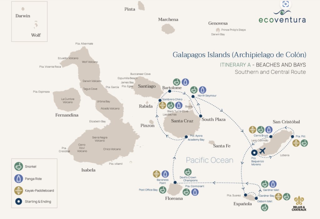 Ecoventura’s vacation travel experience features daily shore excursions (usually starting at dawn, after the buffet-style breakfast) as passengers are ferried via the Zodiacs to the island’s landing point. The Zodiac landings are two types (depending on the island/destination) – wet (you must step into the water and wade to shore) and dry (you step from the boat directly to the rock). Around 3-4 hours are spent ashore at each site. In addition to the guided tours are complimentary offered activities like deep water snorkeling (sometimes twice daily), beach swimming, kayaking, and boat rides.
