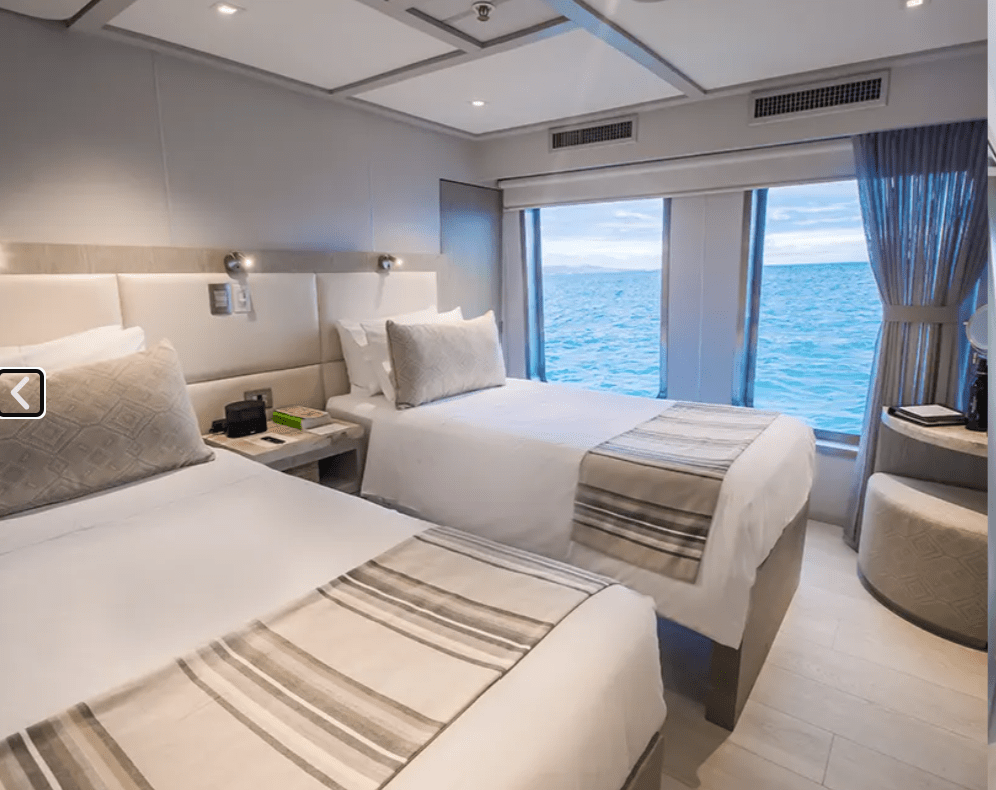 The boat has 4 decks, of which 2 are with cabins (one for the crew, one for the passengers). All passenger cabins being on a single deck is rather unusual (especially for a Galapagos-based ship), as opposed to other ships (superyachts and even smaller boats) where guests’ accommodations spread on two or three decks, and some are with small Portholes (round-shaped windows).MV THEORY staterooms (a total of 10 passenger cabins) are all outside and located on Beagle Deck (main deck 2). All cabins provide luxury hotel amenities and unobstructed ocean views. Four pairs (8 cabins) are with interconnecting doors making them ideal for families. All crew cabins (8 total) are on Finch Deck (lower deck 1).